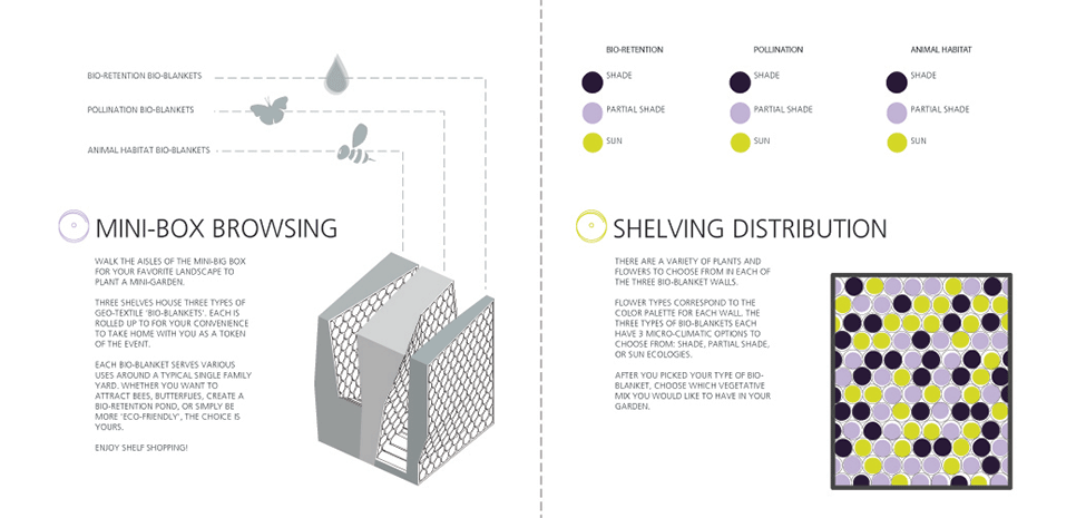 Today, many North American cities can be described as ‘thin carpets of habitation’ held together by a ‘green’ matrix. This is the way Rem Koolhaas famously described Atlanta – more akin to a landscape than a classical city – identifying infrastructure and vegetation as its primary ‘contextual givens’. Rooted in this ecological understanding of the contemporary metropolis, this project proposes an architectural intervention that increases biodiversity in the area through the creation of ‘do-it-yourself ecosystems.’ Utilizing a technology that is underutilized – seed impregnated, bio-blankets – expands the geography and efficacy of the architectural object/project through the popular lifestyle pursuits of shopping and gardening.